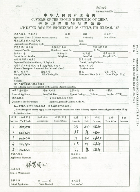中華人民共和國海關(guān)進(jìn)出境自用物品申請表(樣例)