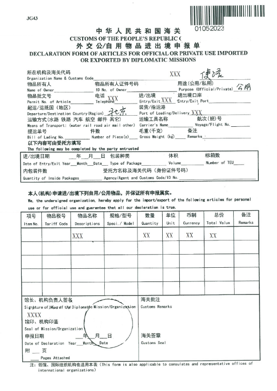 中華人民共和國海關(guān)外交公自用物品進出境申報單(樣例)