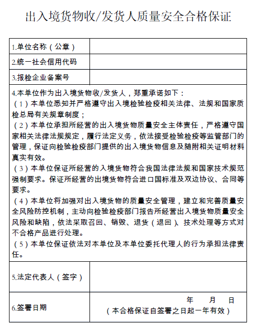 出入境貨物收發(fā)貨人質(zhì)量安全合格保證(模板)