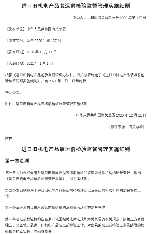 進(jìn)口舊機(jī)電產(chǎn)品裝運(yùn)前檢驗(yàn)監(jiān)督管理實(shí)施細(xì)則