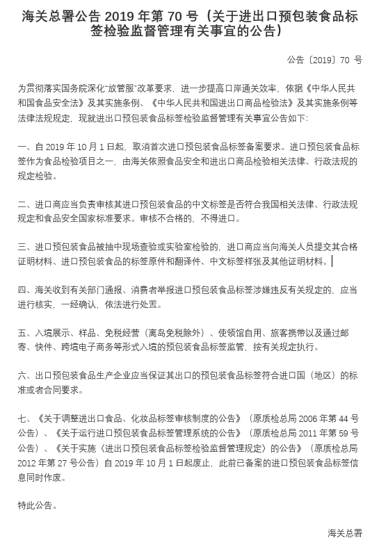 海關(guān)總署公告2019年第70號(關(guān)于進(jìn)出口預(yù)包裝食品標(biāo)簽檢驗監(jiān)督管理有關(guān)事宜的公告)