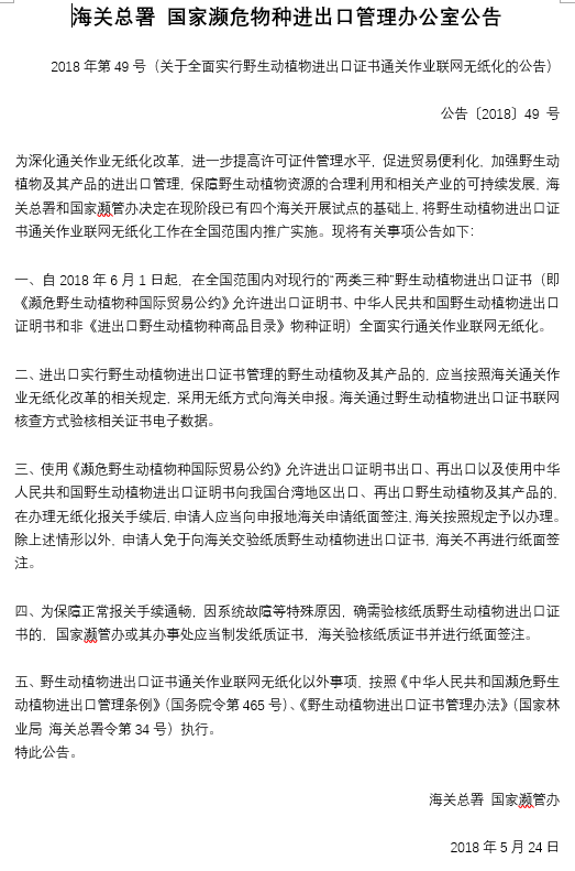 海關(guān)總署國(guó)家瀕危物種進(jìn)出口管理辦公室公告2018年第49號(hào)(關(guān)于全面實(shí)行野生動(dòng)植物進(jìn)出口證書(shū)通關(guān)作業(yè)聯(lián)網(wǎng)無(wú)紙化的公告)