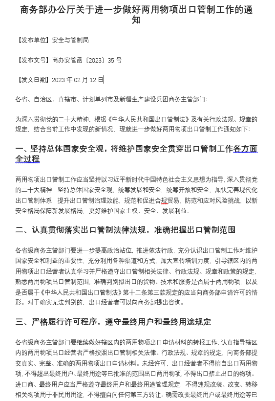 商務(wù)部辦公廳關(guān)于進(jìn)一步做好兩用物項(xiàng)出口管制工作的通知
