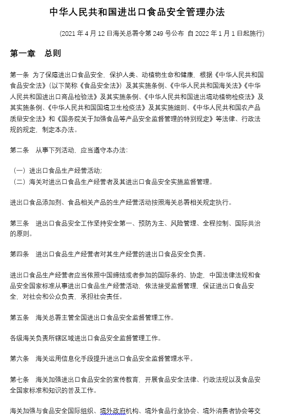 中華人民共和國進(jìn)出口食品安全管理辦法