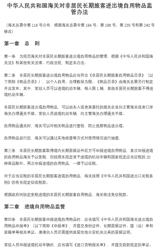 中華人民共和國海關(guān)對(duì)非居民長期旅客進(jìn)出境自用物品監(jiān)管辦法