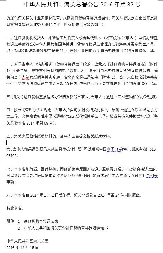 海關(guān)總署公告2016年第82號(hào)(關(guān)于進(jìn)一步規(guī)范進(jìn)口貨物直接退運(yùn)業(yè)務(wù)相關(guān)事宜的公告)