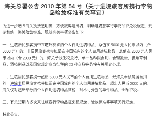 海關(guān)總署公告2010年第54號(hào)(關(guān)于進(jìn)境旅客所攜行李物品驗(yàn)放標(biāo)準(zhǔn)有關(guān)事宜)