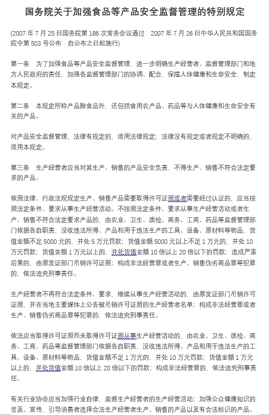 國務(wù)院關(guān)于加強食品等產(chǎn)品安全監(jiān)督管理的特別規(guī)定