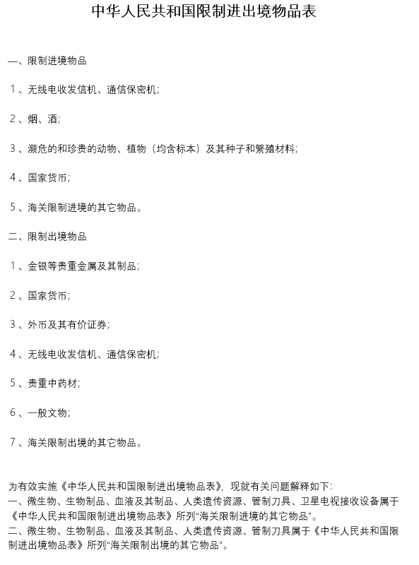 中華人民共和國限制進(jìn)出境物品表